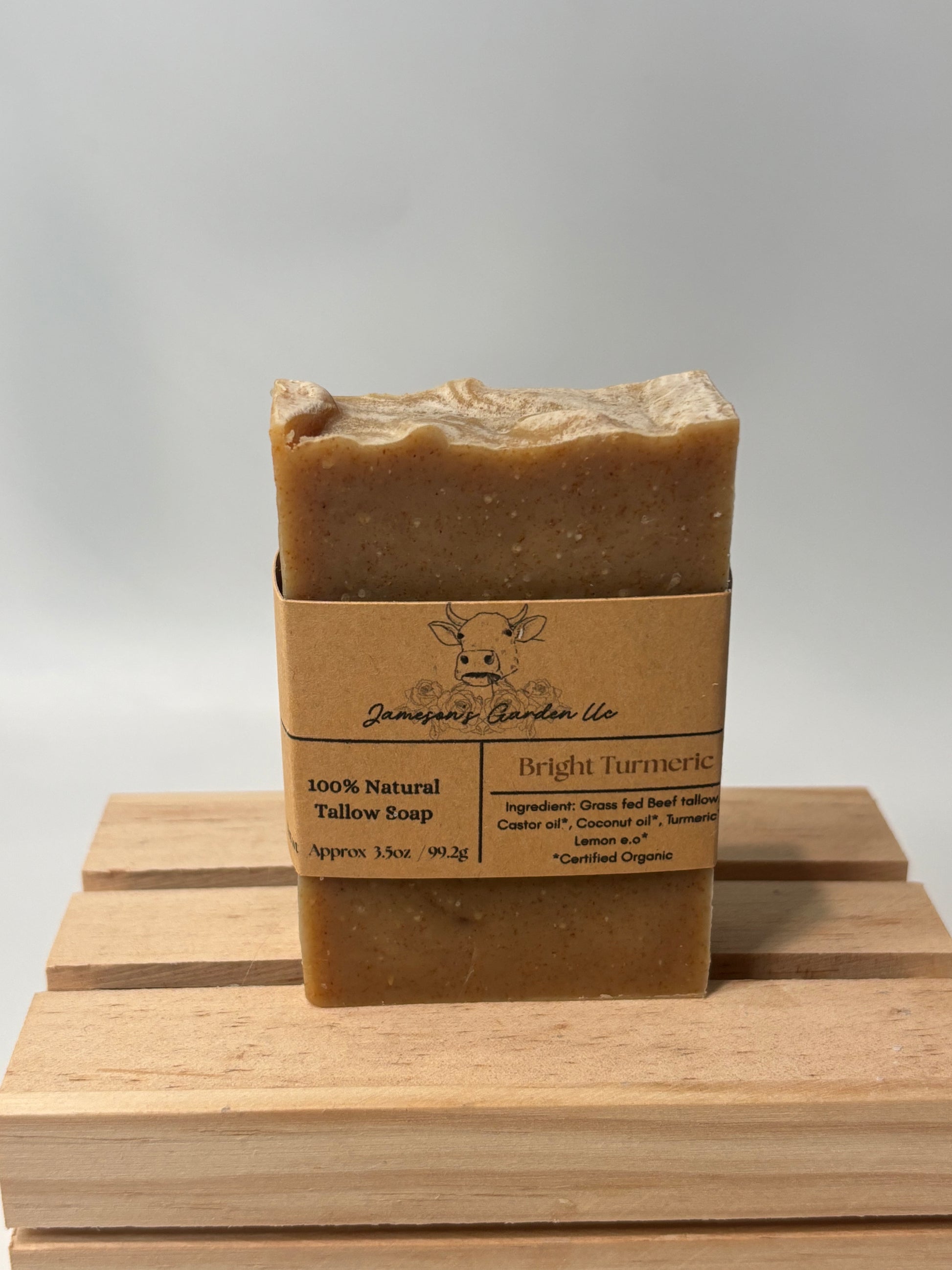 Saponified beef tallow made with organic castor oil, organic coconut oil, organic turmeric and organic lemon essential oil.